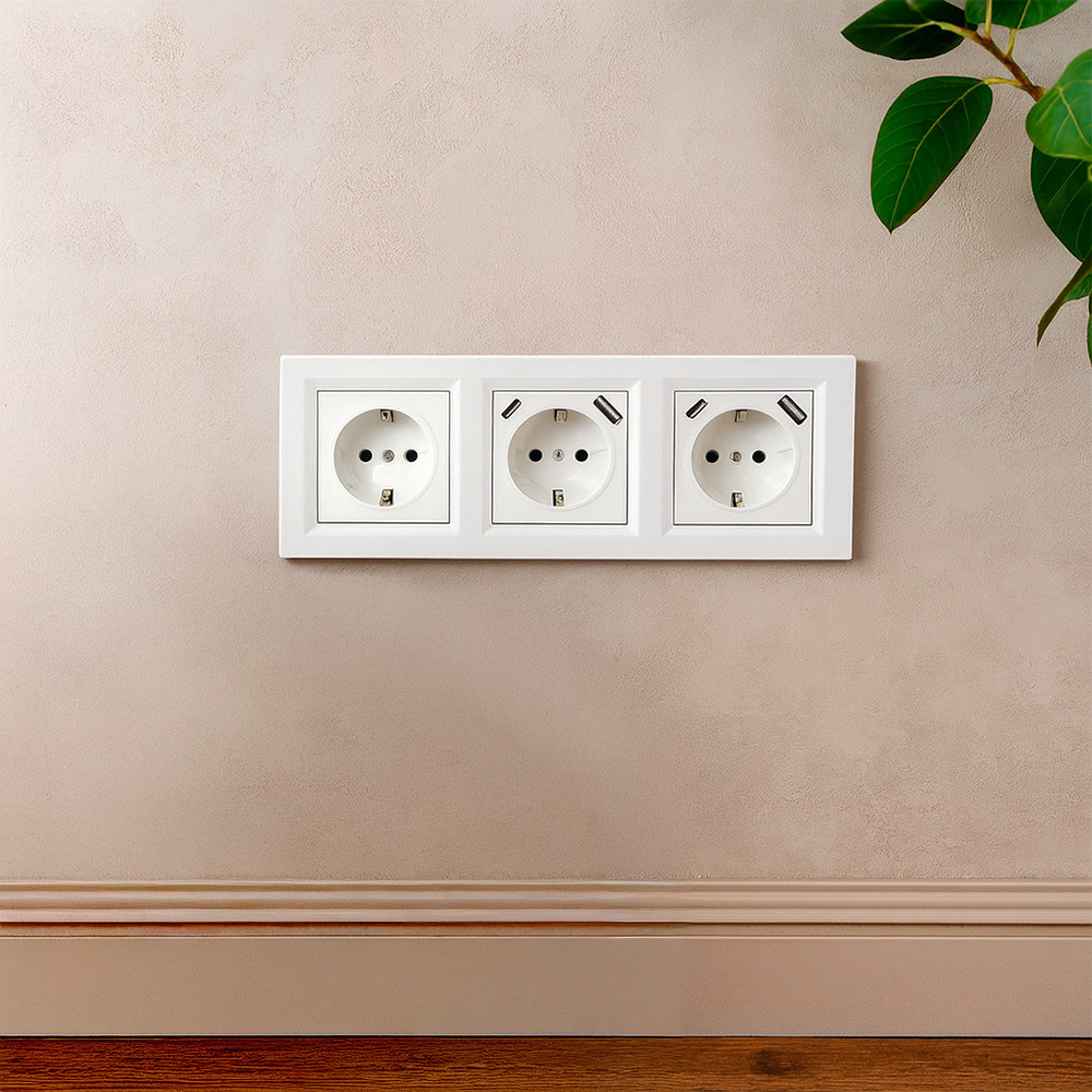 A Nova III földelt csatlakozóaljzat kettő USB csatlakozóval praktikus és modern megoldást nyújt, amely egyesíti a hagyományos 230 V-os hálózati áramellátást és a közvetlen USB töltés kényelmét. A földelt aljzat 16 A névleges áramerősséggel és 250 V AC feszültséggel működik, míg az USB-A és USB-C portok összesen legfeljebb 2 A töltőáramot biztosítanak, ideálisan kisebb fogyasztású eszközök, például mobiltelefon, okosóra vagy fülhallgató töltésére, külön adapter nélkül. A süllyesztett kivitelű, csavaros rögzítésű aljzat szabványos szerelvénydobozba illeszthető, a tartozék fehér keret pedig esztétikus megjelenést és egységes stílust biztosít a Nova szerelvénycsalád más elemeivel. IP20-as védettsége miatt kizárólag száraz, pormentes, beltéri környezetben használható, mint például nappali, hálószoba vagy iroda. A villamos csatlakoztatást minden esetben érvényes szakképesítéssel rendelkező villanyszerelő végezze a hatályos szabványoknak megfelelően.