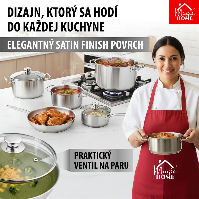 A MagicHome Chloe 28 cm-es, 4 literes serpenyő a rozsdamentes acél időtállóságát ötvözi a modern konyhák eleganciájával. Szatén felülete elrejti az ujjlenyomatokat, és ellenáll a mindennapos karcolásoknak, így a csillogás évek múltán is megmarad. A kényelmes, szegecselt fogantyú stabil fogást ad, az átlátszó üvegfedő pedig lehetővé teszi, hogy szemmel tartsd az ételt a gőz kiengedése nélkül. 6,5 cm-es mélysége bőséges helyet kínál leveseknek, raguknak és pirított zöldségeknek. A tripla alj alumínium magja gondoskodik a gyors felmelegedésről, az egyenletes hőeloszlásról és a takarékos energiahasználatról.