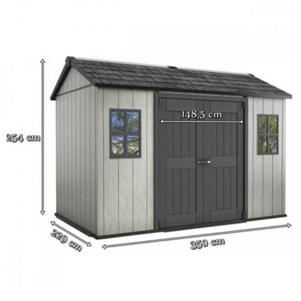 A Keter Oakland 1175 kerti ház szilárd műanyagból készül. A magassága 242 cm magas, 350 cm széles és 229 cm mély. A ház maximum fehasználási területe 6,5 m2 ! Ez a gyártó által javasolt modellek közül a legnagyobb, minden bizonnyal elfér minden benne, ami a kert szépítéséhez szükséges.