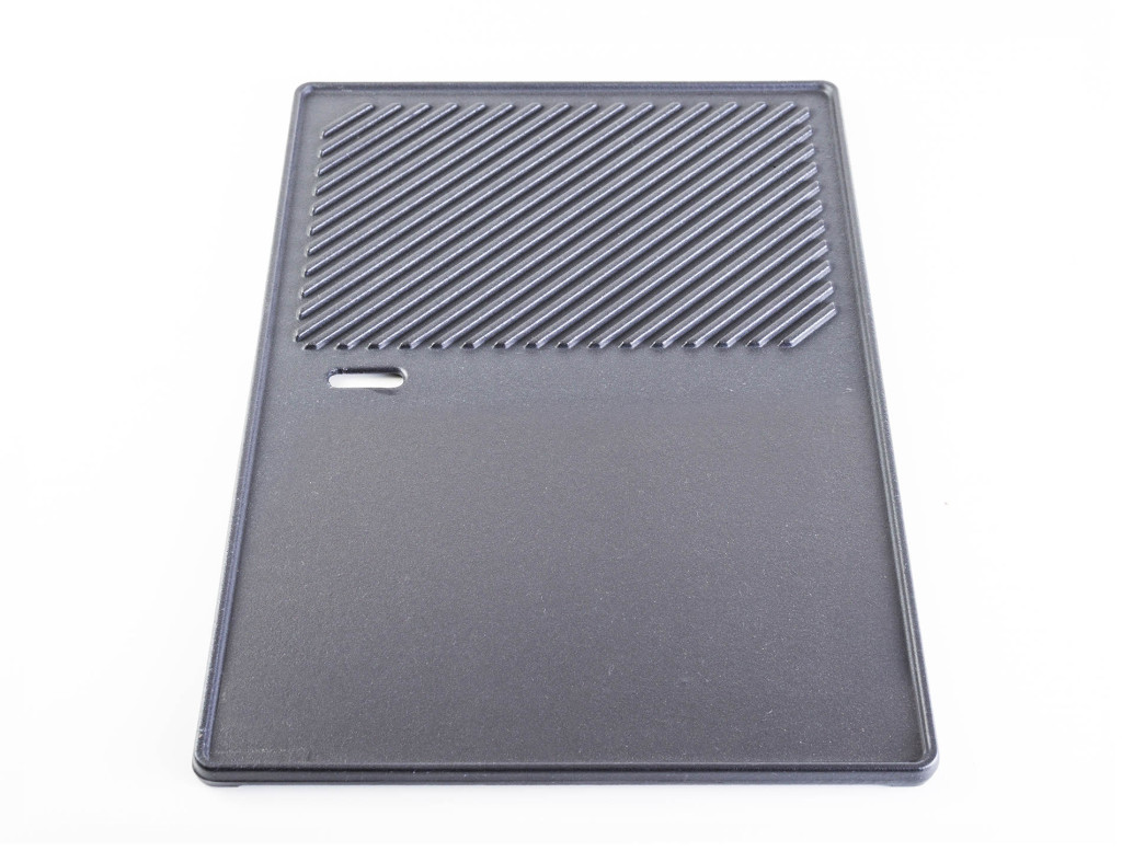 Az öntöttvas az egyik legtartósabb anyag grillezéshez. Ellenáll a magashőmérsékletnek és a karcolásoknak is. Ez az öntöttvas lemez két részrevan osztva. Az egyik fele sima, melyet főleg a szeletelt zöldségek,tojások és sajtok grillezésére használják. A másik fele bordázott, ezta steak, nagyobb zöldségek és halak szerelmesei fogják leginkábbértékelni.