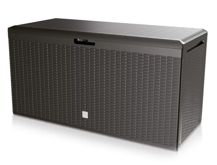 Kerti doboz 290 l térfogatú. Rattanra emlékeztető kialakítás. Ideális a kertbe, pergolába vagy erkélyre. Fedél a tetején. Fogantyúk a könnyű kezeléshez. A láda egyszerű összeszerelése szerszámok nélkül.