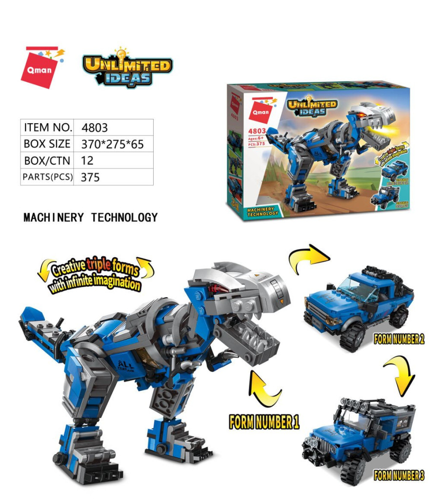 Qman Korlátlan ötletek 4803 Mechanikus technológia 3 az 1-ben - a tudomány és technológia összekötése, ez a mechanikus tyranosaurus. Az építőkockákbül a T-Rexen kívül 2 különböző autót lehet összeállítani. Nem mérgező ABS műanyagból készül és a csomagban 375 elemet talál. Az építőkockák kompatibilisek a Lego-val, Sluban-al, Cobi-val, stb..
