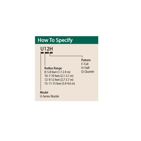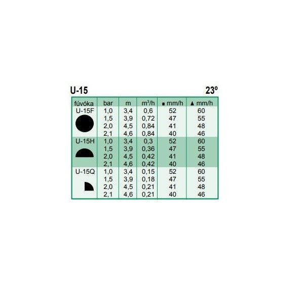 A Rain Bird Spray fúvóka családja a kis és közepes kertek gazdaságos megoldása. A Rain Bird U-15F fix 360°-os spray fúvóka sugara 3,4-4,6 méter között állítható. Minden fúvókához tartozik egy szűrő is. A színkódoknak köszönhetően könnyen azonosítható a fúvóka fajtája és a maximális öntözési távolsága. A speciálisan kialakított fúvóka két nyílással rendelkezik, így tökéletesen megöntözi a szórófejhez közelebbi és a távolabbi területeket is. Spray fúvókákkal való öntözés esetén fontos, hogy a szomszédos szórófejek önözzék meg egymást, így alakítható ki a megfelelő átfedés.