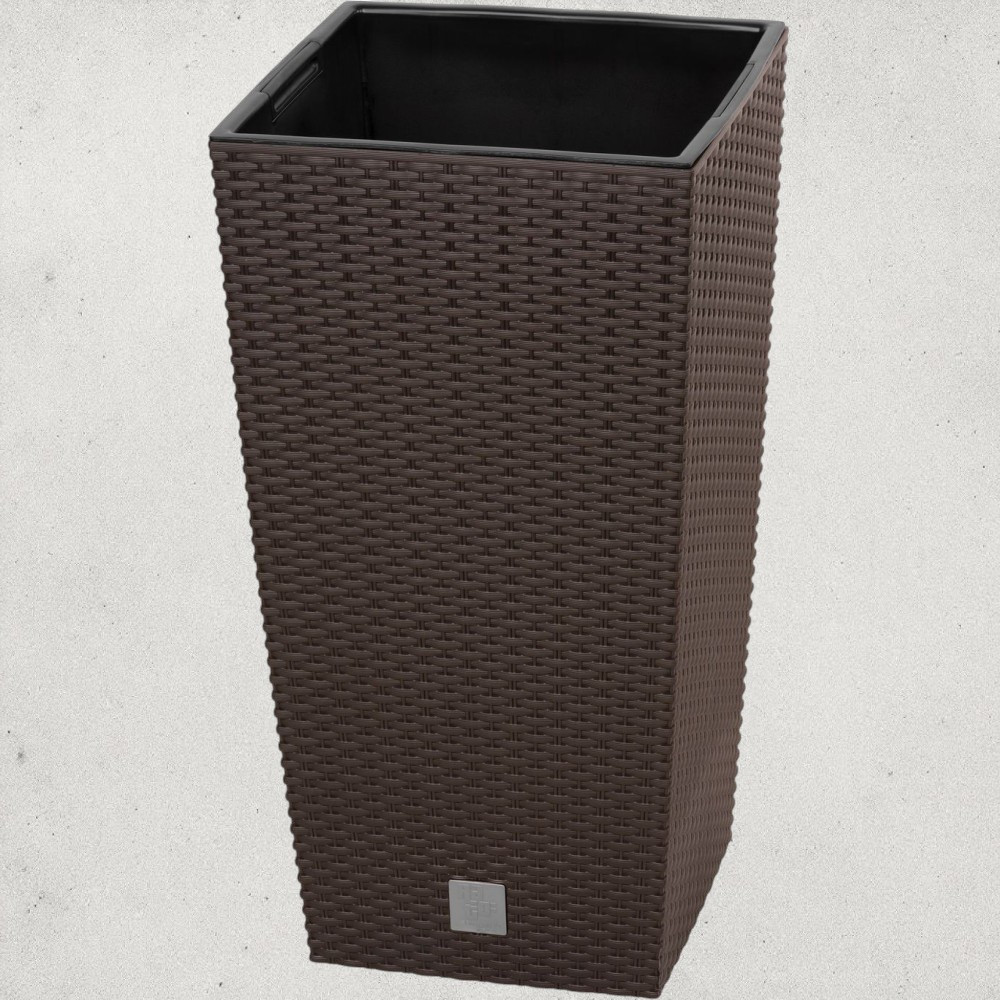 A Prosperplast RATO Square 325 virágcserép karcsú, 61 cm magas testével látványosan megemeli a növényeket, így a lombozat azonnal a figyelem középpontjába kerül. A 32,5 × 32,5 cm-es alap stabil tartást ad, míg a barna, rattan hatású felület otthonos, természetközeli hangulatot varázsol erkélyre, teraszra vagy nappaliba. A kivehető betétnek köszönhetően akár 21 liter földdel is beültetheted, de igény szerint kihasználhatod a teljes 49 literes kapacitást is – így ugyanaz a cserép kis és nagy gyökérzetű növényekhez egyaránt ideális.