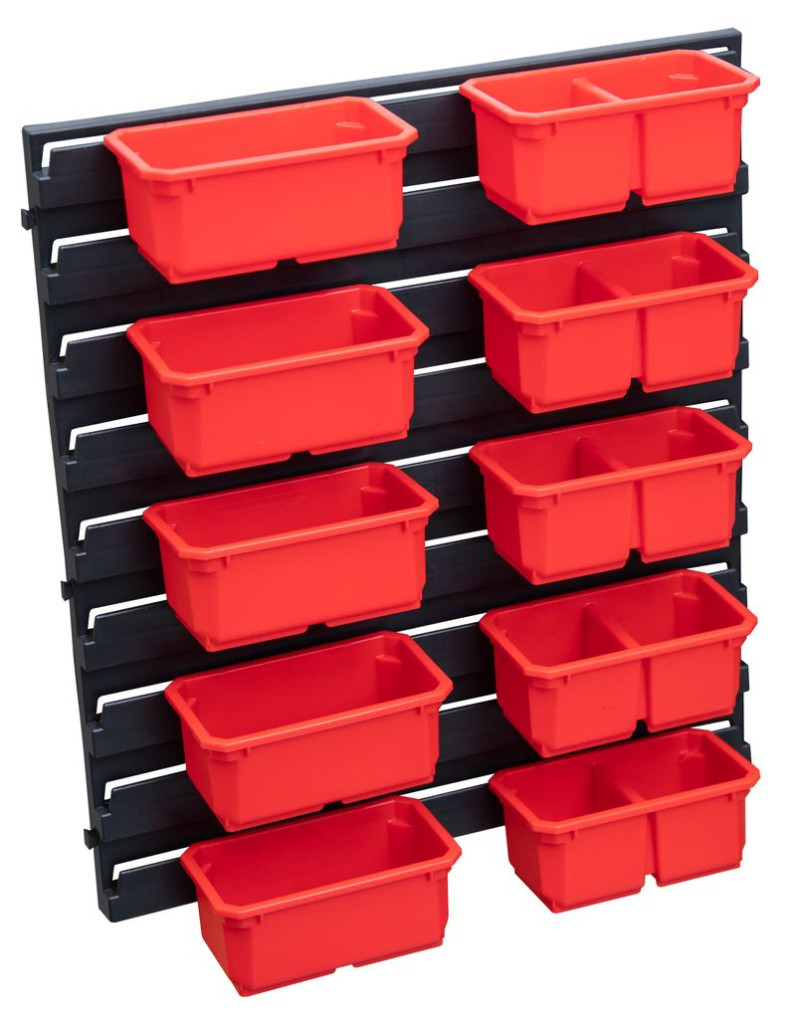 A QBRICK® ONE Organizer M/L 11 részes fali készlettel pillanatok alatt rendet teremthetsz a műhelyben, garázsban vagy hobbiszobában. A masszív, 60 × 43 cm-es panelre pattintható piros tárolódobozok az apró csavaroktól a nagyobb alkatrészekig mindent biztonságosan befogadnak. A dobozok vegyes méretűek, így egyszerre kínálnak helyet a gyakran használt csavarhúzóknak és a legapróbb tipliknek is. A 0,9 kg-os szett könnyű, mégis stabil, ütésálló műanyagból készült, ezért hosszú távon is bírja a mindennapos igénybevételt.
