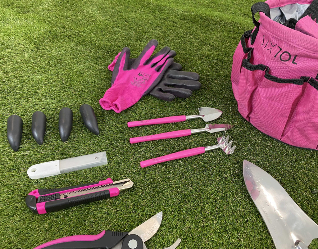 Sixtol Garden Pink 10 kerti szerszámkészlet a gyepen kiterítve