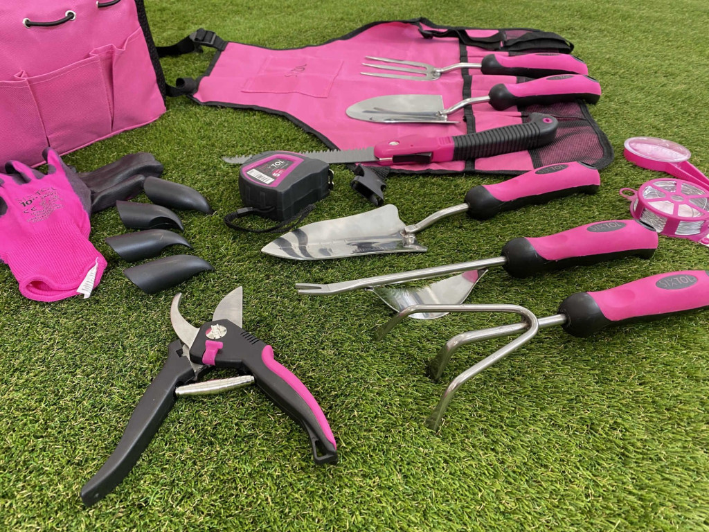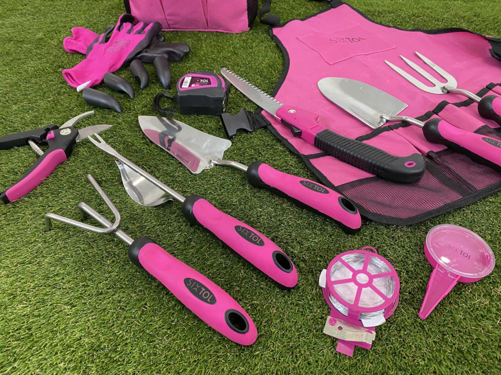 Sixtol Garden Pink 12 kerti szerszámkészlet a gyepen kiterítve