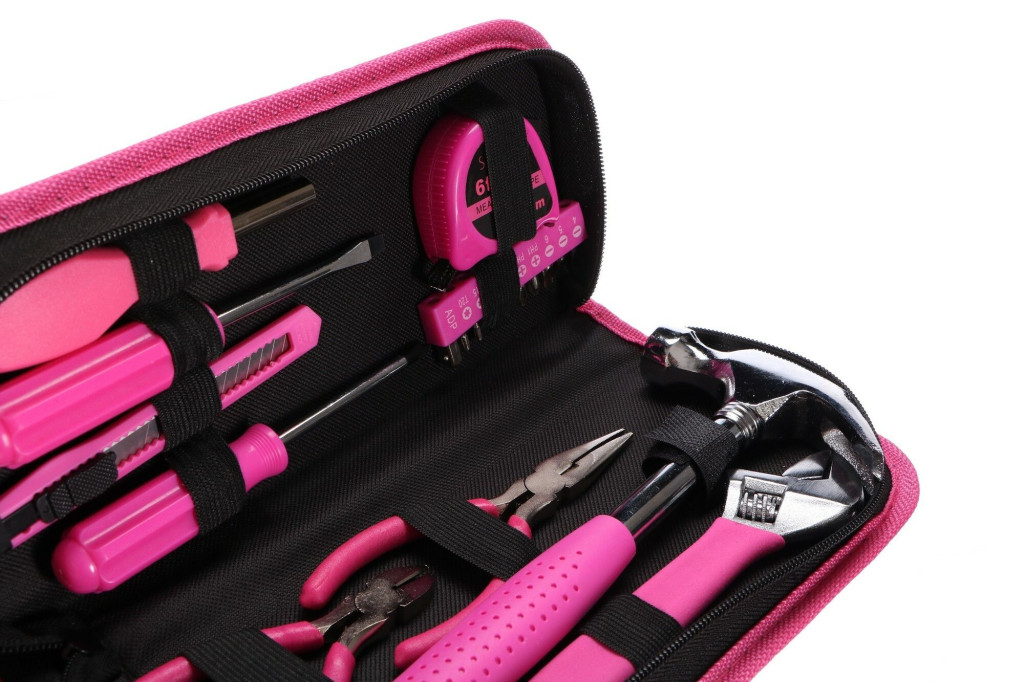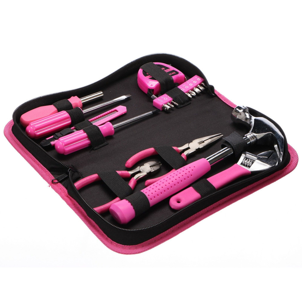 Szerszámkészlet, összesen 20 darab szerszám, ideális otthoni és műhelyi munkákra, könnyen hordozható és tárolható az apró méreteinek köszönhetően, szénacélból, szövettáska, fekete -rózsaszín kialakítás.