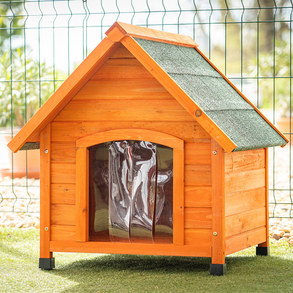 - Kialakítás: sátortetős, klasszikus fa kutyaház