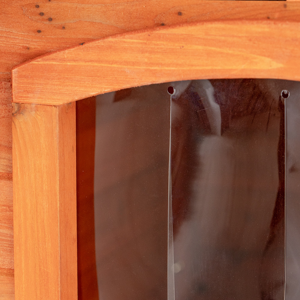 A kutyaház teteje tégla hatású, homokolt kátránypapírral van borítva, ami biztosítja az időjárásállóságot és extra védelmet nyújt. A széles tetőtúlnyúlások a külső oldalakat és a bejáratot is védik az esőtől, széltől és hidegtől. Az átlátszó lamellás ajtó ideális esős időben és véd a huzattól.