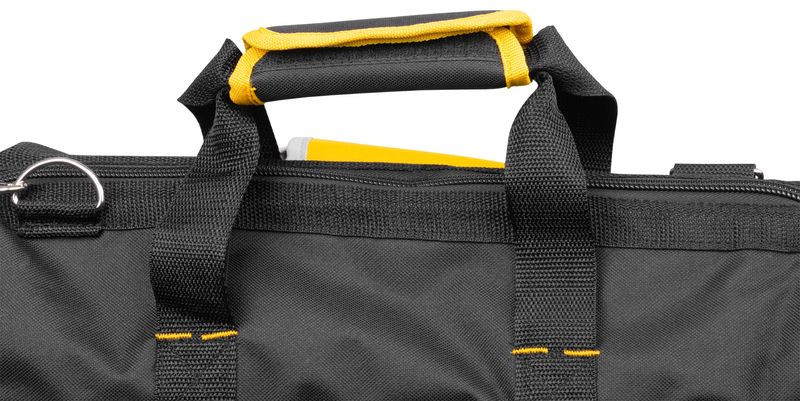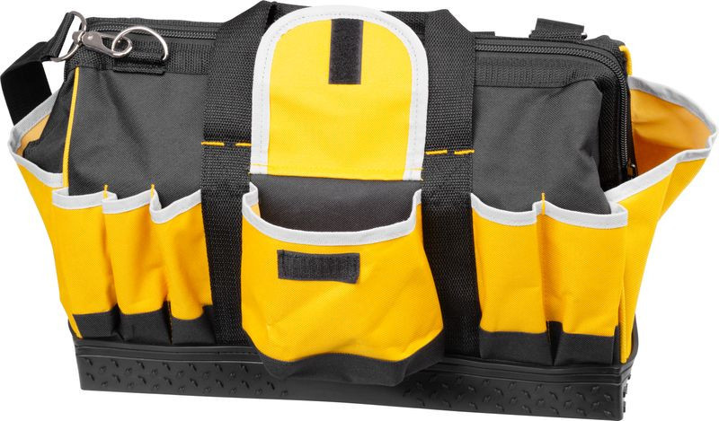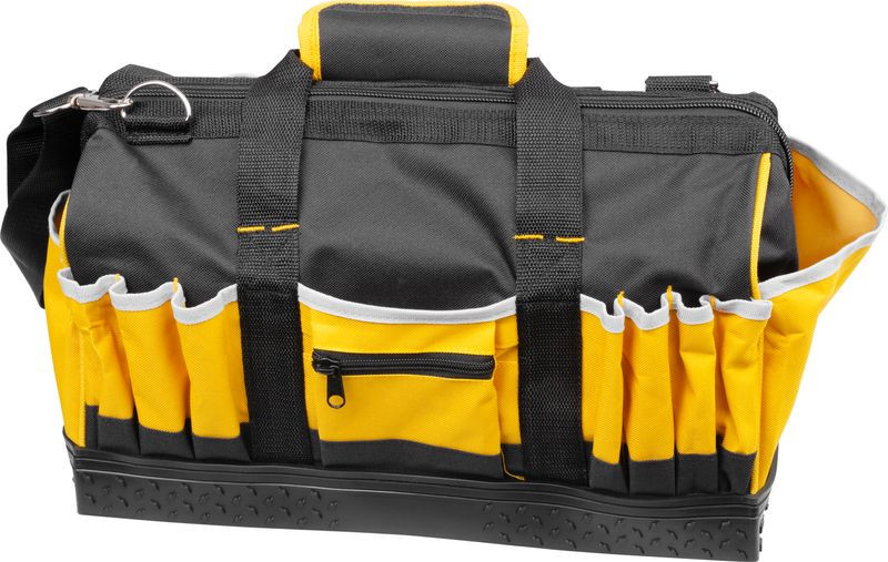 Egy jól pakolható, zárható táska, amely elviseli a mindennapi igénybevételt: strapabíró textil fala nem szakad ki a csavarok éles szélétől, a gumi borítású alj nem ázik fel pocsolyában sem, a párnázott vállpánt pedig teher alatt is kíméli a vállat. A külső–belső elrendezés átláthatóvá teszi a szerszámparkot, így nem időzöl perceket egy elveszett bitfej keresésével, a cipzár pedig megakadályozza, hogy bármi kipotyogjon autózás közben.
