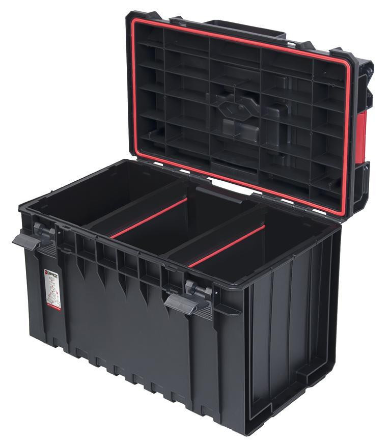 A QBRICK® System ONE 450 Technik szerszámos láda 52 literes belső terével igazi óriás a műhelyben: a nagyméretű elektromos gépek és kéziszerszámok is kényelmesen elférnek benne. A megerősített fedél- és testszerkezet 50 kg terhelést, valamint 120 kg nyomást bír el, így munkaállványként is helytáll. A fedélbe épített rugalmas tömítés teljes por- és vízvédelmet ad, a két állítható rekesz pedig segít rendben tartani a kiegészítőket.