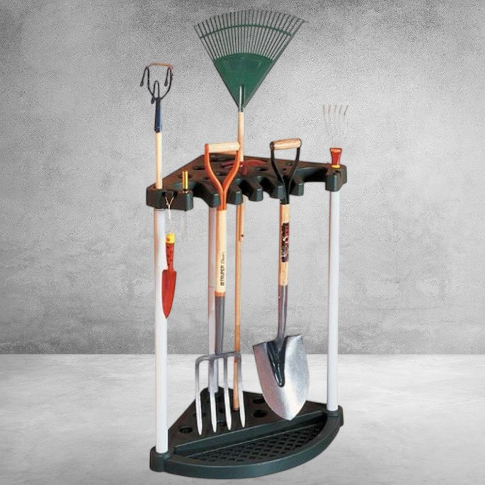 Unod már, hogy a gereblye, lapát és ásó mindig egymásra dől a garázsban? A Keter® 17361063 sarok állvánnyal pillanatok alatt rendszert viszel a káoszba. Háromszög alapú, stabil műanyag váza 24 hosszú nyelű kerti szerszámot fogad be, így a falhoz tolva is minimális helyet igényel. Mindössze 2,5 kg, mégis 20 kg terhelést bír, ezért gond nélkül elbírja a legnehezebb ásót is. A perforált talp megakadályozza a víz felgyülemlését, így a szerszámok szárazon maradnak.