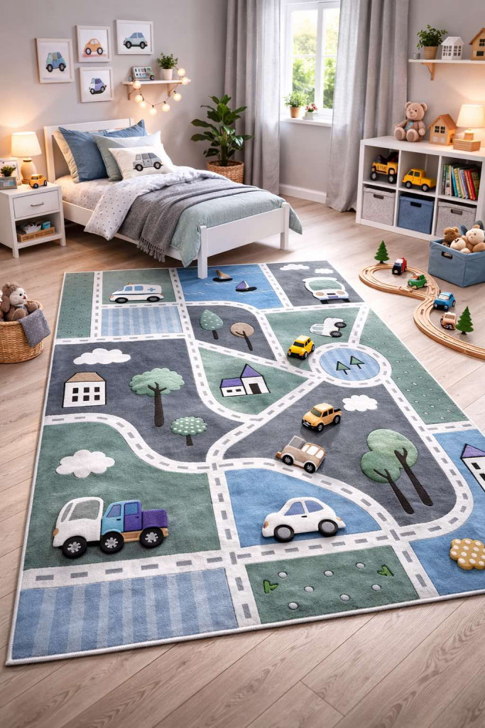 A Mile gyerekszőnyeg vidám mintáival otthonos és játékos hangulatot teremt a gyerekszobában. Puha, poliészter anyagból készült, kellemes érzetet biztosít játék közben is. Praktikus választás a mindennapokra: hátoldala csúszásgátlóval ellátott a nagyobb biztonság érdekében, és kímélő programon, 30 °C-on mosható (centrifugálás nélkül). Mindössze 0,5 cm vastag, így könnyen elhelyezhető és tisztán tartható. Színe: kék-szürke, Mérete: 80 x 150cm, Mintája: autópályás
