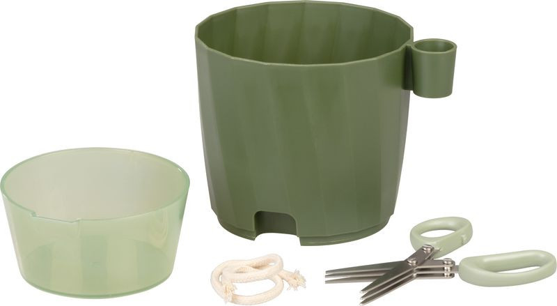 Ez a praktikus cserép egyszerre időt és helyet spórol: az oldalsó tartóban lévő rozsdamentes pengéjű metszőolló mindig kéznél van, így egyetlen mozdulattal levághatod a bazsalikomot vagy formázhatod a díszleveleket. A passzív önöntöző rendszer napokig biztosítja a megfelelő vízellátást, így akkor is friss marad a növény, ha elfoglalt napjaid vannak. A modern, matt zöld árnyalat otthonos, természetközeli hangulatot teremt a konyhában, nappaliban vagy erkélyen.